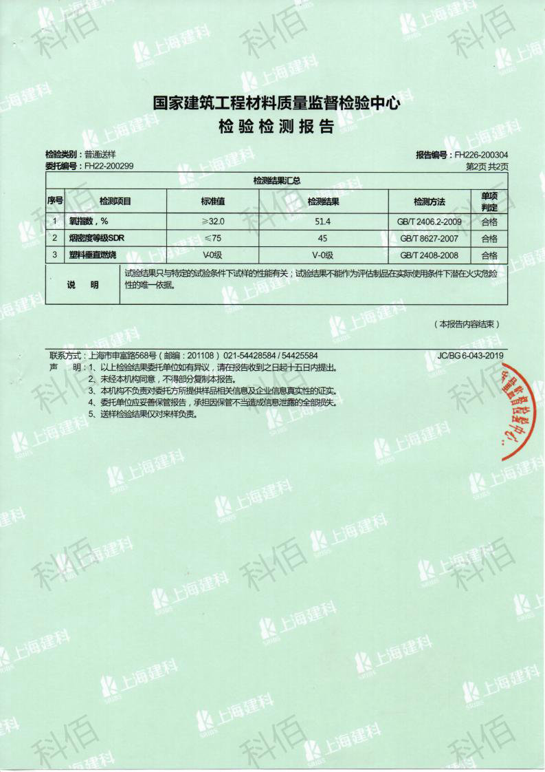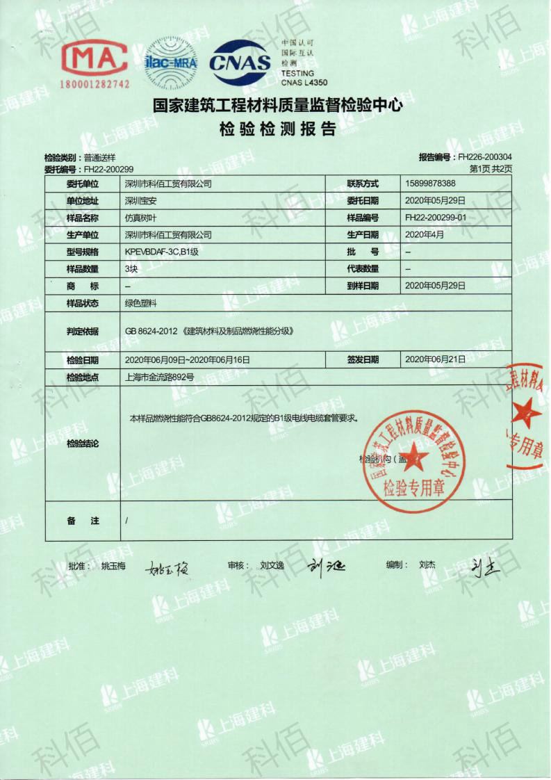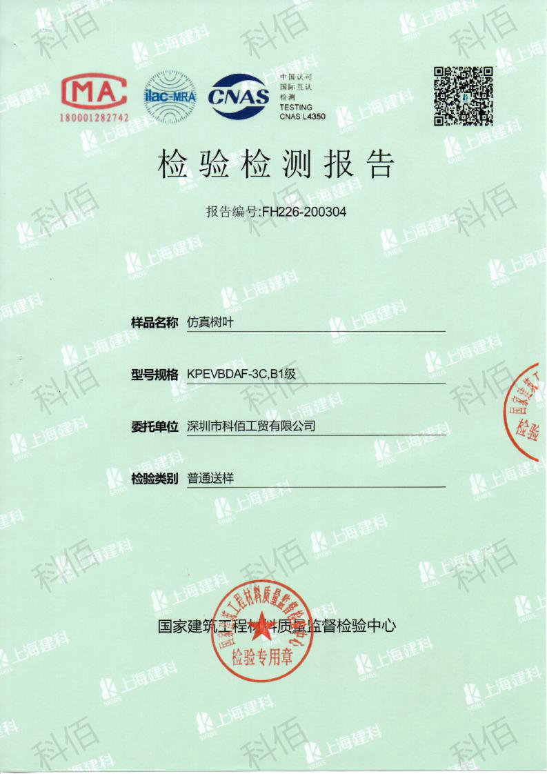 2020年6月份科佰再一次成功通過國家建筑工程材料質量監督檢測對仿真樹葉產品進行防火燃燒性能檢測,檢測科佰仿真樹葉產品的質量過硬,達到了B1級的防火阻燃要求。此次仿真樹葉檢測燃燒性能是指材料燃燒或遇火時所發生的一切物理和化學變化,不同材料的防火性能決定了改材料的防火等級,科佰研發實驗室開展對各類防火產品的抽查檢驗,委托第三方檢測對科佰產品進行防火燃燒性能檢測,對各類送檢材料進行嚴格的防火性能測試、防火等級檢測,可出具權威資質認證、國家認可的檢測報告和分析報告。