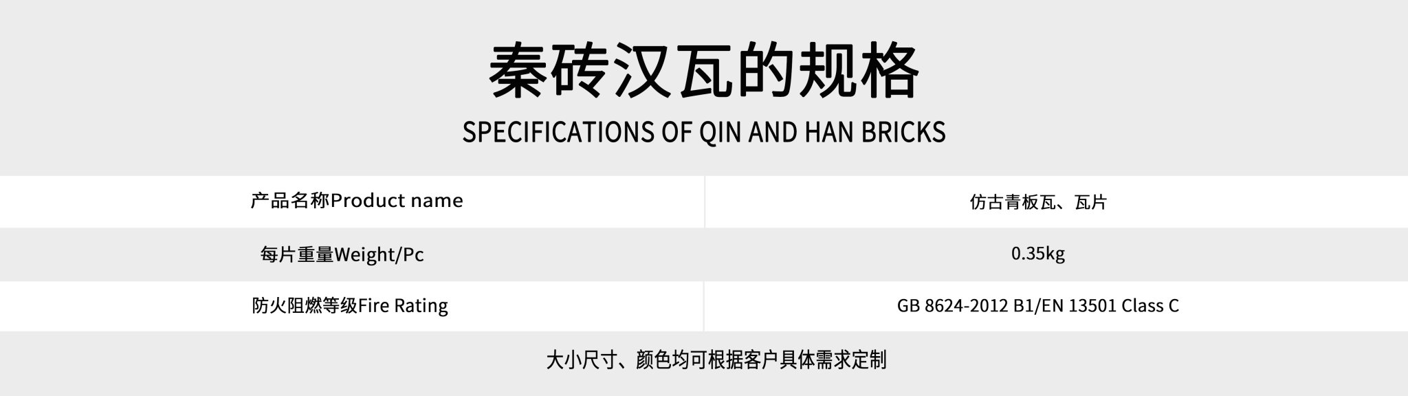 仿古青瓦-板瓦導熱系數為0.325W/mk,是粘土瓦的1/3,厚水泥瓦的1/5,0.5mm厚彩鋼瓦的1/2000。在不考慮加保溫層的情況下,合成秦磚漢瓦的隔熱保溫性能達到更佳。