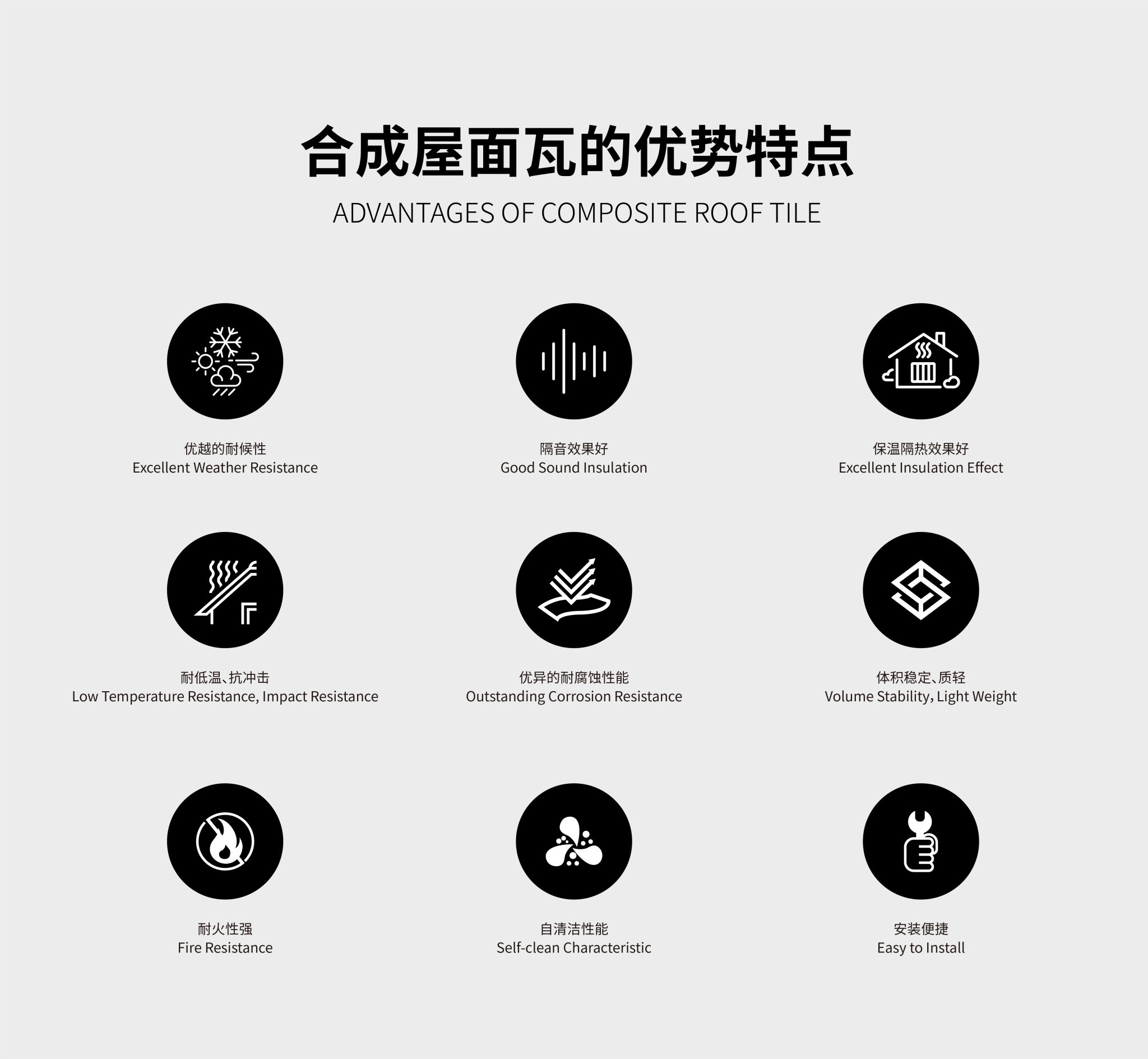 ? ? ? ? 合成屋面瓦是深圳市科佰工貿有限公司采用目前國際上先進的納米合成高分子改性樹脂,高強纖維,納米空心微珠等材料為主原料技術和工藝生產。采用科學的配方和先進的生產工藝,自動化流水線生產的新型環保屋面產品。利用納米粒子的特有的物理化學性質,使得其具有更加優異的耐候性及阻燃性,能滿足美國ASTM-G154-06 抗UV老化測試標準,并能通過美標UL94-V0級阻燃,在國內合成屋面瓦也通過了國家防火建材阻燃測試B1級。?
