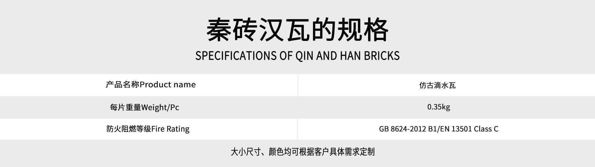 仿古滴水瓦在自然環境中具有更佳尋常的耐久性,它即使長期暴露于紫外線、強光、潮濕、寒熱等惡劣環境下,仍能保持其顏色和物理性能的穩定性。經試驗檢測證明,可以確保15年△E值小于5。合成屋面瓦通過了12000小時的人工老化測試,檢測結果△E=3.86。(根據太陽照射量和年日照時間,12000小時檢測試驗相當于自然使用45年,遇冷不脆、遇熱不軟,長期使用環境溫度-40℃至200℃,與鋼鐵熱膨脹系數基本一致,使因溫差產生的位移基本相等。