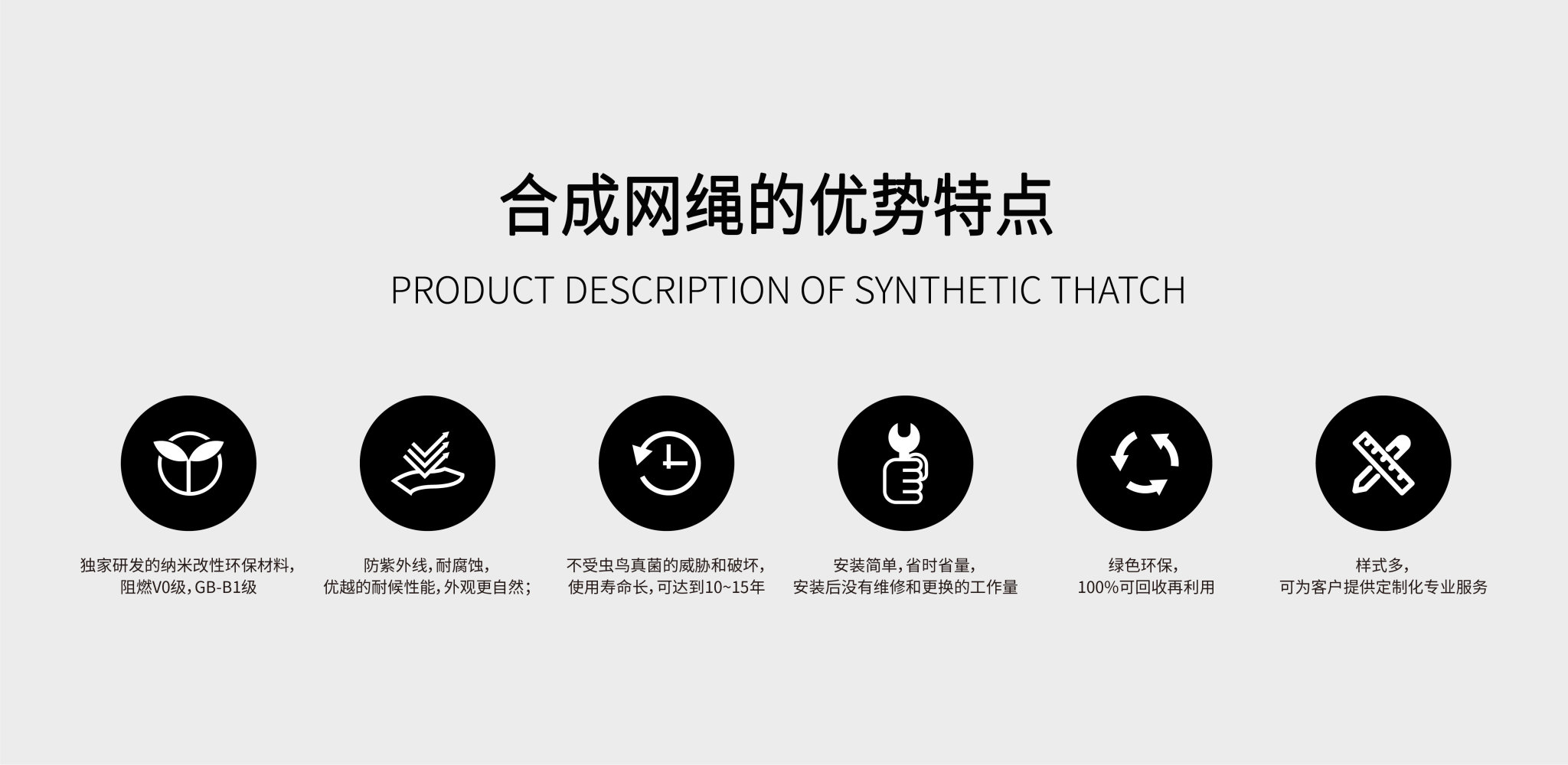 ? ? ? ? 景觀皮革繩是深圳市科佰工貿有限公司采用目前國際上先進的納米合成高分子材料技術和工藝生產。利用納米粒子的特有的物理化學性質,使得其具有更加優異的耐候性及阻燃性,能滿足美國ASTM-G154-06 抗UV老化測試標準,并能通過美標UL94-V0級阻燃,在國內綁扎茅草繩也通過了國家防火建材阻燃測試B1級。?